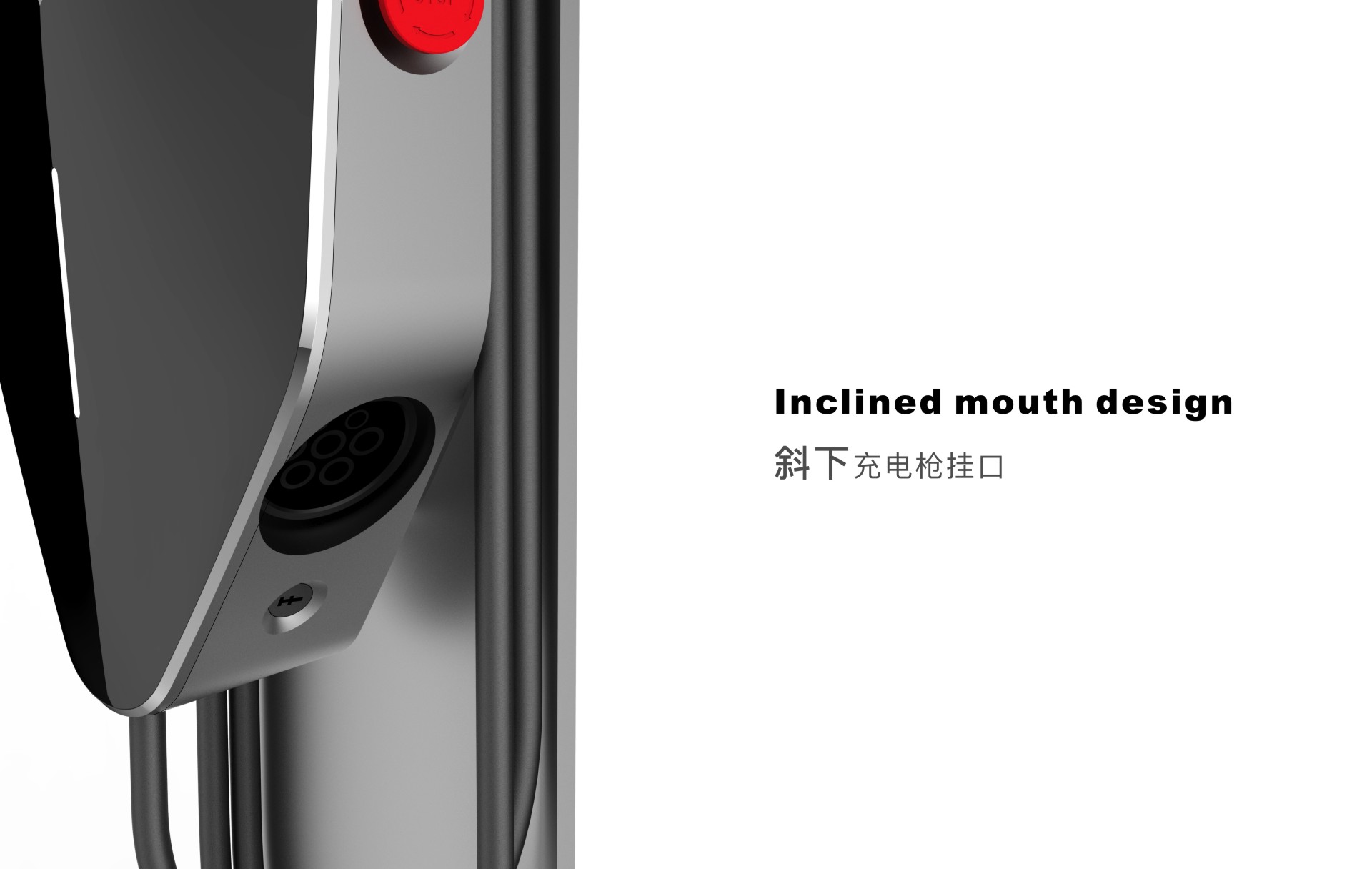 小牛皮提手设计解决了搬运时需要双手的问题,便于搬运。斜下充电枪挂口设计,解决了常规水平挂口,尘土杂质等残留物容易积存的问题。
