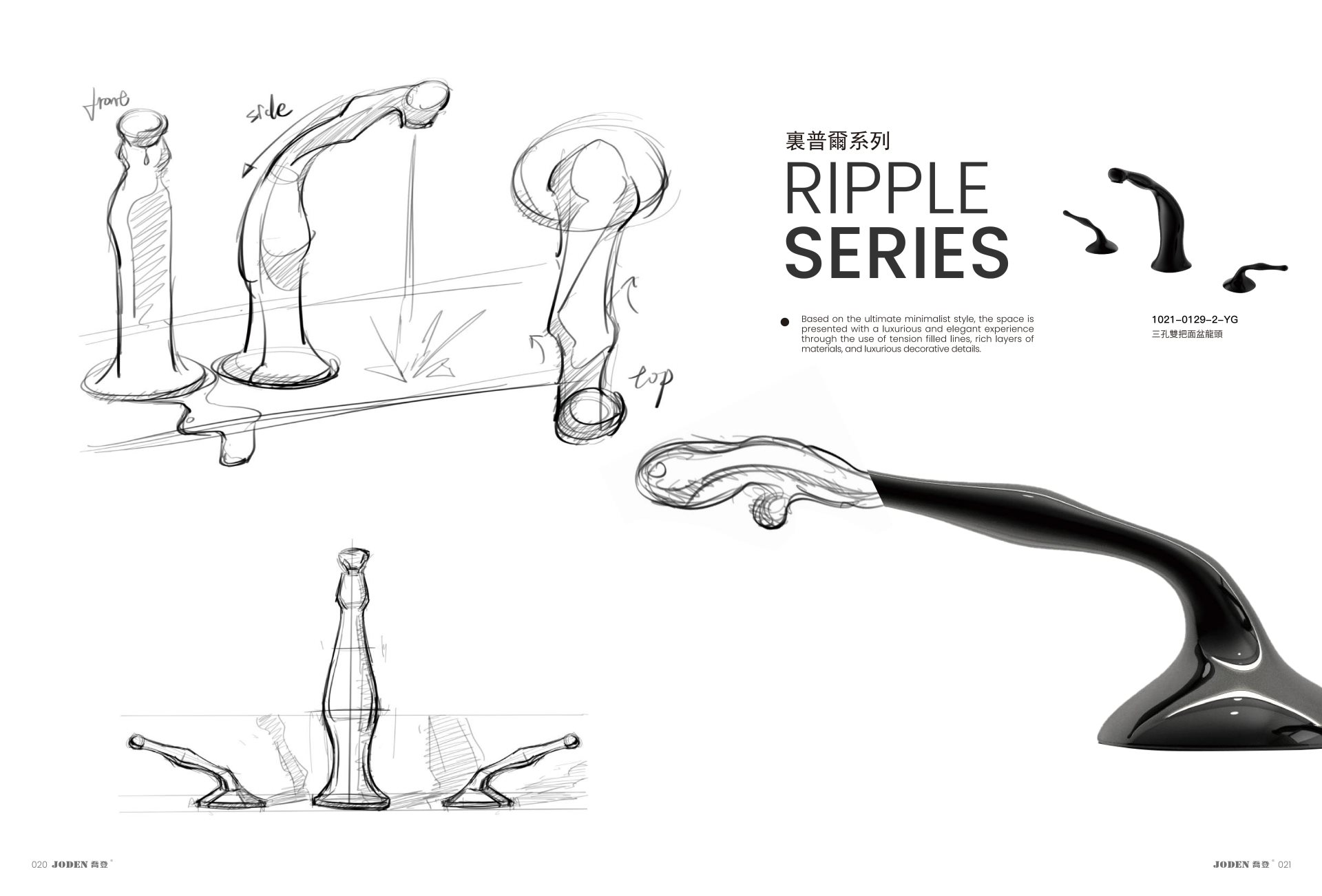 在创作过程中,设计师运用了多种产品设计手法,包括草图绘制、手绘图表达以及3D模型构建,不断探索与完善。每一步都倾注了对完美的追求,直至水龙头呈现出液态金属的视觉效果。金属电镀工艺的应用,让产品在具有高度辨识度的同时,也展现了现代工艺与自然美感的完美结合。